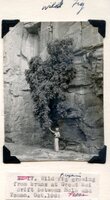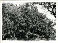Caption: "The Wonderboom, Ficus pretoriae, north of Pretoria. April 1965. The central parent trunk was 12 ½ feet in diameter. The secondary growth consists of 7 separate daughter groups but two of these form grand-daughters which form a third circle around the central parent. The whole canopy is given as about 165 feet in diameter, and about 75 feet high. The measurements were 186 feet. The mother tree consists of 5 close-growing stems and her canopy is about 99 feet overall. A notice at the site says that this tree was probably able to develop in this way through being held sacred and dedicated by burial to a chief and then given tribal protection. Although it is large overall it attains this by virtue of the daughter and grand-daughters groups. The fig tree at Kaffir drift has 5 central stems and no daughter groups. It is about 168 feet in diameter of canopy, i.e. without the secondary groups. The big fig tree in Bathurst village has only one central stem yet its canopy diameter is 162 feet in diameter, i.e. from one stem." -