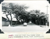Caption: "Arch of Wild Fig trees over Commercial Road, East London. 1959." -