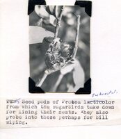 Caption: "Close-up of flowers of Protea subvestita. Showing the pink and white (half-obscured in processing of film) variants. The central flower is still opening. Others around are past their best. The central one is in full nectar flow." -