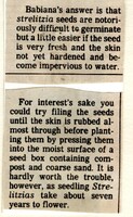 Transcrit: "Babiana's answer is that strelitzia seeds are notoriously difficult to germinate but a little easier if the seed is very fresh and the skin not yet hardened and become impervious to water. For interest's sake you could try filing the seeds until the skin is rubbed almost through before planting them by pressing them into the moist surface of a seed box containing compost and coarse sand. It is hardly worth the trouble, however, as seeding Strelitzias take about seven years to flower." -