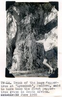 Caption: "Trunk of the huge Pepper-tree at 'Lynedoch', Bedford, said to have been the first pepper tree grown in South Africa. June 1962." -