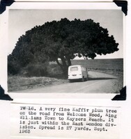 Caption: "A very fine Kaffir plum tree on the road from Welcome Wood, King Williams Town to Kaysers Beach. It is just within the East London division. Spread is 27 yards. Sept. 1963." -