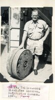Caption "Yellow-wood wheel. Use unknown. Kaffrarian Museum. 1960. 4 such wheels were found behind Museum. Navras' shop in market Sq. at his dispersal sale in about 1959. Inquiries revealed that they were made to carry a line trailer for transporting heavy electrical equipment from the railway station to the power station. The iron bands and axles show no wear at all. " -