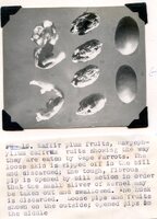 Caption: "Kaffir plum fruits, Harpephyllum caffrum. Fruits showing the way they are eaten by Cape Parrots. The loose skin is ripped off in the bill and discarded; the tough, fibrous pip is opened by bill action in order that the small sliver of kernel may be taken out and swallowed. The husk is discarded. Loose pips and fruits shown on the outside; opened pips in the middle." -