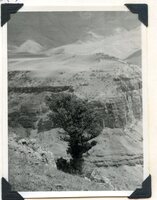 Caption "A lone yellowwood Podocarpus latifolius. Growing in rock crevice at the edge of the Injasuti River valley below Cathedral Peak in the Drakensburg. It has been saved from extinction by fire by being rock-bound. The flames could not get at it. Lower in the valley and pattern of relief forest that suggest heavy National afforestation in these parts in the past."