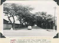 Caption "Arch of Wild fig trees over Commercial Road, East London. 1959." -