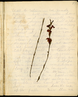 Loose-pressed plant specimen mounted directly onto a handwritten manuscript page from a bound volume. The specimen consists of two slender flowering stems affixed to the page, integrating botanical material with personal written notes. This item illustrates informal and field-based botanical collecting and documentation practices, where specimens were preserved alongside observational or diary-style records rather than on standard herbarium sheets. -