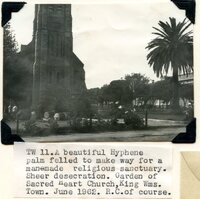 Caption "A beautiful Hyphene palm felled to make way for a man-made religious sanctuary. Sheer desecration. Garden of Sacred Heart Church, King Wms. Town [King William's Town]. June 1962. R.C. of course." -