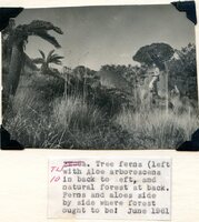Caption "TW 10. Tree ferns (left) with Aloe arborescens in back to left, and natural forest at back. Ferns and aloes side by side where forest ought to be! June 1961." -