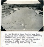 Caption "EW 10. Looking down Bashee R., from National Road bridge. Banks virtually denuded and only the lightest scrub on hills ½-mile away there is dense scrub up the valley. Nov. 1963." -