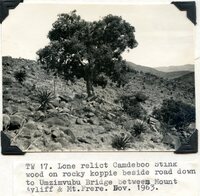 Caption "TW 17. Lone relict Camdeboo Stink wood on rocky koppie beside road down to Umzimvubu Bridge between Mount Ayliff & Mt. Frere. Nov. 1963." -