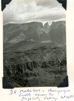 Caption "D8. Across the Injasuti Valley to Champagne Castle, Monk's Cowl, Cathkin Peak. Oct. 1958." -