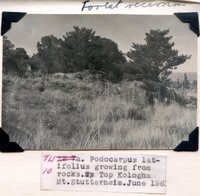 Caption "TW 10. Podocarpus latifolius growing from rocks. Top Kologha Mt. Stutterheim. June 1961." -