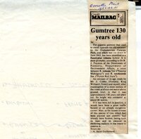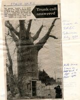 Newspaper article: "Trunk call answered". With two handwritten notes: "Also shown on S.A.B.C. Television July 1980", and, "Note some scars on bark to left of the door ...".
