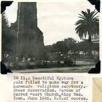 - Caption "A beautiful Hyphene palm felled to make way for a man-made religious sanctuary. Sheer desecration. Garden of Sacred Heart Church, King Wms. Town [King William's Town]. June 1962. R.C. of course."
