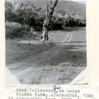 - Caption "Dead yellowwood tree on Lange Vlakte farm, Alexandria, 10 km SW Alexandria town. 1980. The tree had been burnt and killed, apparently by blacks taking honey from its hollow stem. Photo C.J. Skead, 1980."
