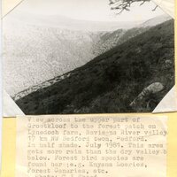 - Caption "View across the upper part of Grootkloof to the forest patch on Lynedoch farm, Baviaans River valley 17 km NW Bedford town, Bedford. In half shade. July 1981. This area gets more rain than the dry valley below. Forest bird species are found here, e.g. Knysna Loeries, Foret Canaries, etc."