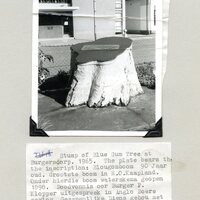 - Caption: "Stump of Blue Gum Tree at Burgersdorp. 1965. The plate bears the inscription: Blougomboom 90 Jaar oud. Grootste boom in N.O. Kaapland. Onder hierdie boom waterskema geopen 1898. Doodvonnis oor Burger P. Klopper uitgespreek in Anglo Boere oorlog. Gesamentlike Diens gehou met vorming van Unie van Suid Afrika. Gedenkplaat onthul met eeufees ossewatrek op Burgersdorp, 12 Oktober 1938."