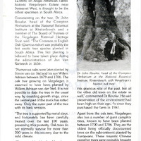- Article from presumably 'Tha Naturalist', published in 19?2. Abstract taken from first paragraph: "An oak tree dating back to the 17th Century with a diameter of four metres (and a circumference of 12,66m) on Anglo American Farms' historic Vergelegen Estate near Somerset West, is thought to be the oldest specimen in South Africa."