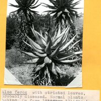 - Caption: "Aloe ferox with striated leaves, probably diseased. Normal plants behind. On farm 'Clifton', 19 km NW Grahamstown, near Pigott Bridge, Fish River valley. Plant later removed to farm garden. 1978."