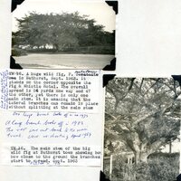 - Caption: "A huge wild fig, F. natalensis in Bathurst, Sept. 1963. It stands on the corner opposite the Pig & Whistle Hotel. The overall spread is 56 yards one way and 47 the other, yet there is only one main stem. Ii is amazing that lateral branches can remain in place without splitting at the main stem. One large branch broke off in ca 1975. A large branch broke off in 1983. The rest were cut back to the main trunk. The main stem of the big wild fig at Bathurst town showing how close to the ground the branches start to spread. Sept. 1963. Planted in 1918."