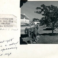 - Caption: "Gerry Broekhuysen kneeling beside the fig tree planted by Mr. van Oordt at De Hoop. Sept. 1961. Seen in August 1988 this tree was a robust and wide-spreading tree of good size."