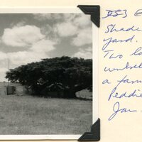 - Caption: "Shade for the farmyard. Two lovely spreading umbrellas at a farm house in the Peddie district. Jan. 1959."