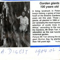 - Newspaper article: A living landmark in Pietermaritzburg's history, a grove of trees in the heart of the Botanic Gardens, is 100 years old this year. These gnarled giants, all planted in 1884 or earlier, are "probably the most representative selection of exotic trees in South Africa". according to the curator of the Gardens, Mr Brian Tarr. He sees education as the real function of a botanical garden. Picture: Mr Tarr among the roots of a giant Morton Bay fig planted more than 100 years ago. The Natal Witness. S.A.Digest. 1984-03-23.