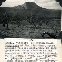 - Caption: "Orchard of Protea multibracteata at Fort Merriman, upper Kubusie Valley. Sept. 1962. In open grassland. Mount Kubusie in the background. Occurs about 10 miles west of Stutterheim town. All trees old and dying. No seedlings coming on. Trees grazed to height of cattle."