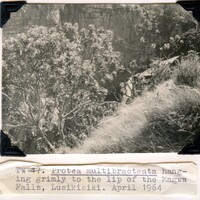- Caption: "Protea multibracteata hanging grimly to the lip of the Magwa Falls, Lusikisiki. April 1964."