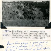 - Caption: "Big Hole at Kimberley with Pepper Trees growing down on the steep slope leading to the vertical walls. April 1959." Handwritten note: "Pepper trees played a great part in providing shade and shelter in the drier hinterland of South Africa. especially round farmsteads, railway stations, etc."