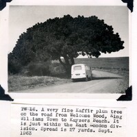 - Caption: "A very fine Kaffir plum tree on the road from Welcome Wood, King Williams Town to Kaysers Beach. It is just within the East London division. Spread is 27 yards. Sept. 1963."