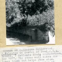 - Caption "Common or Outeniqua Yellowwood, P. falcatus in garden of Prof. J. V. L. Rennie, 7 Oatlands Road, Grahamstown. May 1977. The stone wall hides the lower trunk but helps show size. Sapling was dug by the Rennies at Pirie Forest, King Williams Town, in 1945 when about 30cm high. Thus, in about 22 years in photo in 1977. The bole diameter at 1 metre from the ground was 304mm. Photo taken from the corner of Oatlands Road."