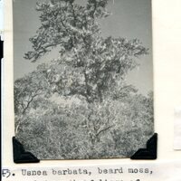 - Caption "Usnea barbata, beard moss, draped from the foliage of a longifolius yellowwood as Isidenge. The yellowwood stands well above the surrounding canopy. 1959."
