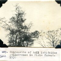 - Caption "Silhouette of tall latifolius yellowwood in Pirie Forest. 1959."
