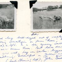 - Caption "Yellowwood log full-dryed out of valley during dam-building operation on farm. Amabele, Jack Blaine, c. 1955. In an open valley where owner had never known trees. But lower down yellowwood grew well. Identified as yellowwood of forest. Jack Blaine, left and John Beck outside."