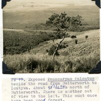 - Caption "Exposed Podocarpus falcatus beside the road from Butterworth to Idutywa. About 17,6 km north of Butterworth. There is another out of view to the left. This must once have been a good forest."