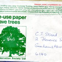 - Caption "re-use paper save trees. Conservation Society Ltd. C.J Skead. 2 Florence St. Grahamstown. 6140."