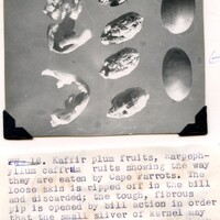 - Caption "Kaffir Plum fruits, Harpephyllum caffrum fruits showing the way they are eaten by Cape Parrots. The loose skind is ripped off in the bill and discarded; the tough, fibrous pip is opened by bill action in order that the small sliver of kernal may be taken out and swallowed. The husk is discarded. Loose pips and fruits shown on the outside; opened pips in the middle."
