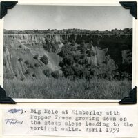 - Caption "Big Hole at Kimberley with Pepper Trees growing down the steep slope leading to the vertical walls. April 1959."