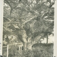 - Caption "The main stem of this big wild fig at Bathurst town showing how close to the ground the branches start to spread. Sept. 1963. Planted in 1918. One large branch broke off in 1975. A large branch broke off in 1983. The rest were cut back to the main trunk. Were re-shooting 1984."