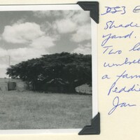 - Caption "Shade for the farm yard. Two lovely spreading umbrellas beside a farm house in the Peddie district. Jan. 1951."