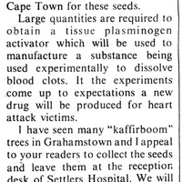 - Caption "Lucky Bean seeds needed. Sir. I have received an appeal from Cape Town for these seeds. Large quantities are required to obtain a tissue plasminogen activator which will be used to manufacture a substance being used experimentally to dissolve blood clots. It the experiments come up to expectations a new drug will be produced for heart attack victims. I have seen many 'kaffirboom' trees in Grahamstown and I appeal to your readers to collect the seeds and leave them at the reception desk of Settlers Hospital. We will forward them to Cape Town. I look forward to the usual co-operation of the Grahamstown citizens. Yours etc. Dr. G. de L. White. Medical Superinendent, Grocott's Mail 1985-03-01."