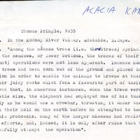 - Transcript: "1822 Thomas Pringle, 1835 April. In The Koonap River Valley, Adelaide, E.Cape. p.126. "Among the mimosa trees (i.e. thorntrees) sprinkled over the meadows, or lower bottoms, the traces of their (i.e. elephant) operations were not less apparent. Immense numbers of these trees had been torn out of the ground and placed in an inverted position in order to enable the animals to browse at their ease on their juicy roots which form a favourite part of their food. I observed that, in numerous instances, when the trees were of considerable size, The elephant had employed one of his tusks, exactly as he would use a crowbar, thrusting it under The roots to loosen their hold on The earth before he attempted to tear them up with his proboscis, many of the larger mimosas had resisted all their efforts, and, indeed, it is only after rains that they can successfully attempt the operation."