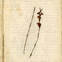 - Loose-pressed plant specimen mounted directly onto a handwritten manuscript page from a bound volume. The specimen consists of two slender flowering stems affixed to the page, integrating botanical material with personal written notes. This item illustrates informal and field-based botanical collecting and documentation practices, where specimens were preserved alongside observational or diary-style records rather than on standard herbarium sheets.