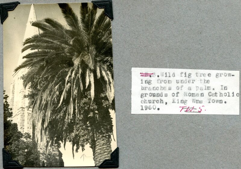Part of Wild fig tree growing from under the branches of a palm