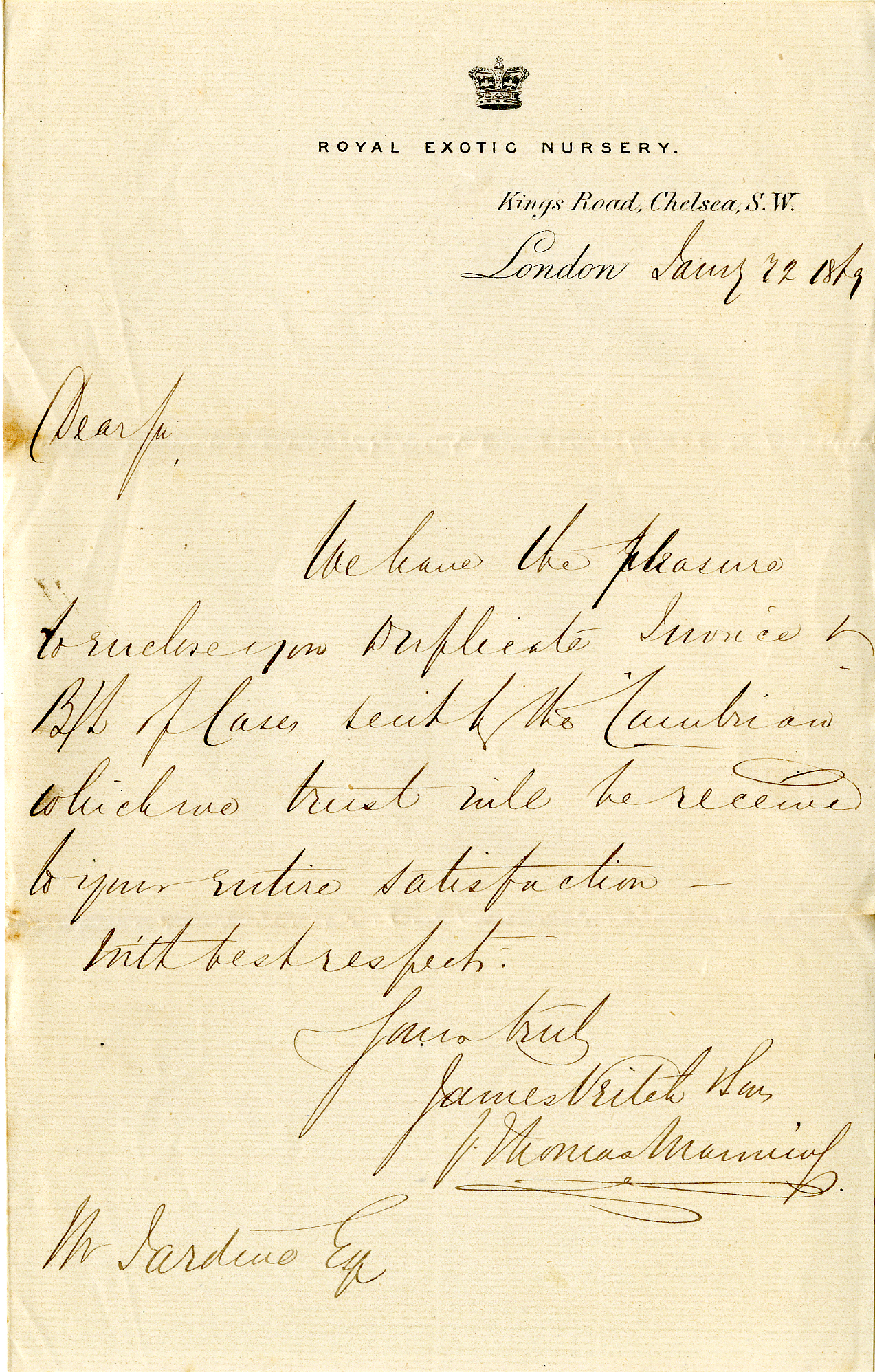 Part of Letter from James Veitch & Sons, on behalf of the Royal Exotic Nursery, to Walter Jardine regarding a bill of landing for Cambrians sent, 1869