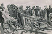 Examining guns captured in the western dessert - Cairo Photographic album : containing photographs of Indian troops and members of an Indian press contingent, taken in the Middle East (including Iraq) and Italy during World War II, taken during a tour by a contingent of Indian Press correspondents, 1945, photographer unknown.