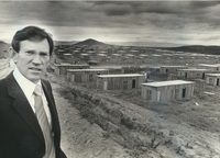 Mr Louis Koch A series of photographs showing views of forced removal of communities from Klipfontein farm, near Kenton-on-sea, and other areas, to Glenmore in 1979. These photographs were accumulated by Ben Maclennan when he worked as a journalist for Eastern Province Herald, covering the move, and when he wrote the book "Glenmore : the story of a forced romoval" This photograph shows Mr Louis Koch, Chief Director of the East Cape Administration Board, standing beside the 500 wood-frame houses comprising the temporary scheme at the Glenmore site on the Fish River. Photograph reprinted by Evert Smith, 12 April 1979