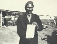 Mr Joseph Gqozombana holds the eviction notice A series of photographs taken at the time of the Klipfontein evictions, the resultant trial at the Supreme Court Grahamstown, and the eventual settlement of those evicted in the Glenmore resettlement location, showing some of the residents involved, officials, members of the press, as well as aerial and on site views of Glenmore. Photographers: Dave Forbes, Ben Maclennan, Evert Smith, and an unknown photographer. This photograph shows a blind Mr Joseph Gqozombana, in Kenton emergency camp, with the eviction notice ordering him to Glenmore. Photograph taken in March 1979.